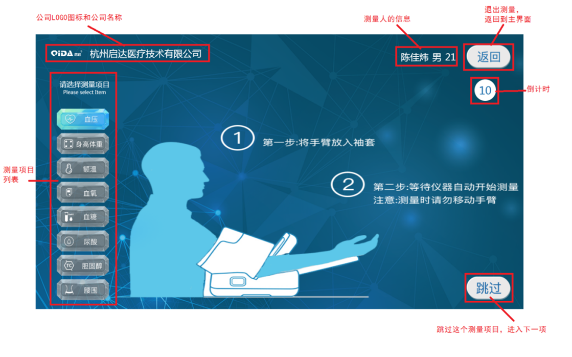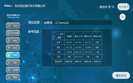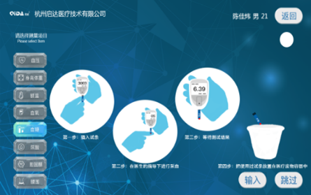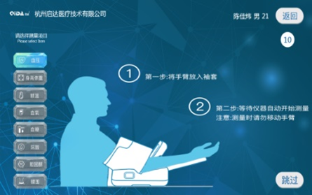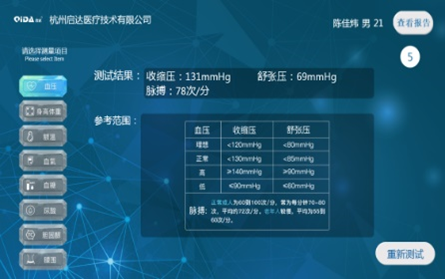 用户登陆成功后,进入测量界面,可进行血压、身高体重、额温、血氧、血糖、腰围等测量。如下图所示: